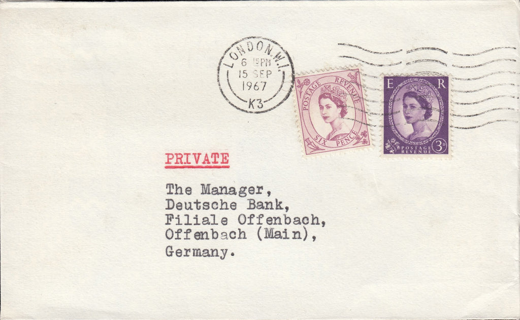 1967 MAIL LONDON TO GERMANY. Envelope London to Offenbach Germany with Wildings 6d and 3d cancelled LONDON 15 SEP 1967. (Ref 119550).