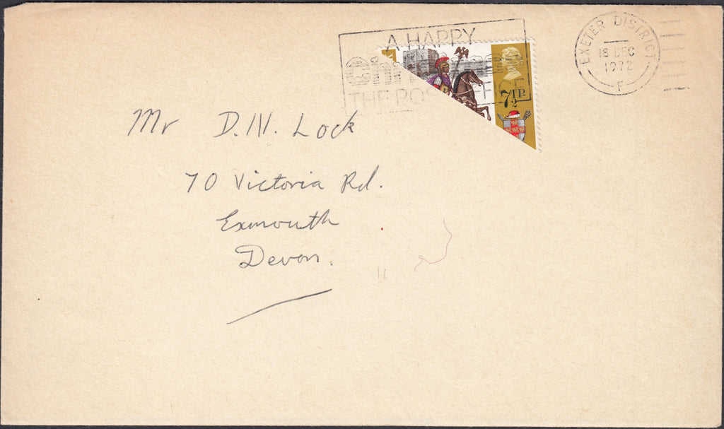 1972 MAIL EXETER TO EXMOUTH VARIETY BISECT 7½P 'ROMAN CENTURION' (SG888). Envelope from Exeter to Exmouth in Devon with fine diagonal bisect 1971 7½p (SG888) tied 'EXETER DISTRICT' slogan cancellation 18 DEC 1972. Unusual. (Ref 132176).