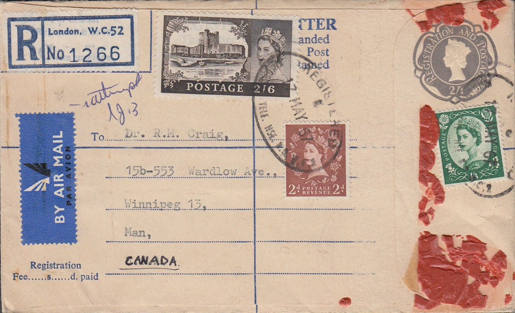 1967 2/1d QEII grey registered envelope London to Canada uprated with 2/6d seahorse also 2d and 1/3d Wildings cancelled 17 MAY 67. (Ref 80537).