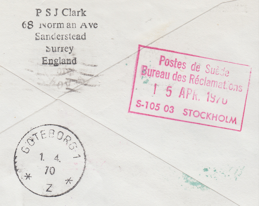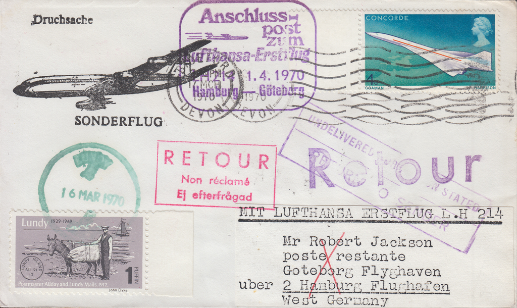 1970 envelope Bideford Devon to Hamburg with 4d Concorde cancelled 17 MCH 1970, also Lundy 1 Puffin cancelled 16 MAR 1970. Envelope undelivered with a good variety of instructional marks. (Ref 84523).
