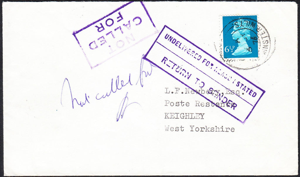1976 UNDELIVERED MAIL. Envelope Codford Wilts to a Poste Restante Keighley Yorks with 6½p Machin cancelled CODFORD/WILTS 6 JY 76 with boxed "NOT CALLED FOR" and "UNDELIVERED FOR REASON STATED..." cachets. (Ref 87369).