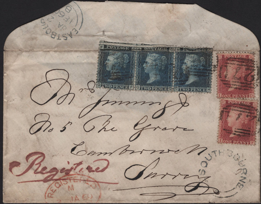 1860 REGISTERED MAIL SOUTHBOURNE, SUSSEX TO CAMBERWELL WITH 1D (SG40) X 2 AND 2D BLUE (SG45) X 3. Envelope sent registered mail from Southbourne to 'Mrs Jennings, No.5 The Grove, Camberwell, Surrey' with die 2 1d rose-red on white paper (SG40) x 2 lettered ID IF paying 2d postage and strip of three 2d blue pl.8 (SG45) lettered GF GG GH paying 6d registered rate, tied '271' numerals of Eastbourne. The 2d's affected by crease and some soiling, on front fine strike 'SOUTHBOURNE' udc and on reverse 'EASTBOURNE' date stamp JA 2 1860. Unusual combination of 'star' and 'letters in all four corners' issues. (Ref 141997).