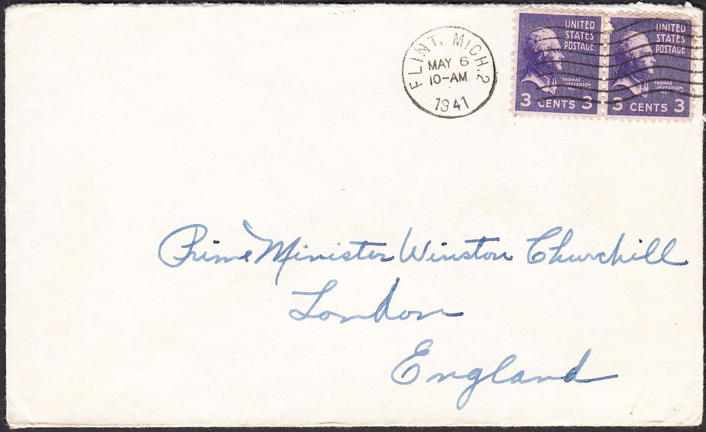 MAIL TO WINSTON CHURCHILL. 1941 envelope Flint USA to "Prime Minister Winston Churchill, London England" with pair US 3 cent cancelled FLINT/MICH MAY 6 1941. (Ref 90262).