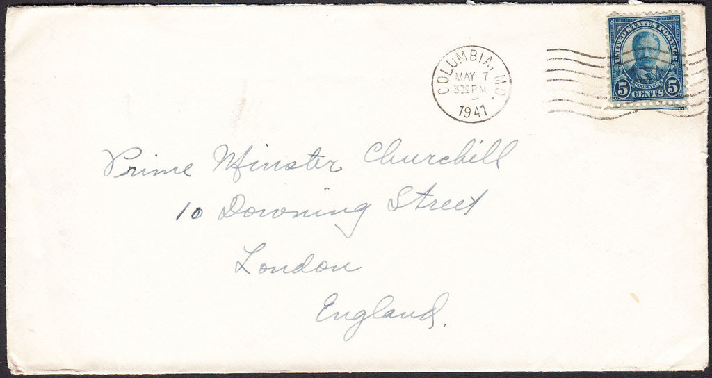 MAIL TO WINSTON CHURCHILL. 1941 envelope USA to "Prime Minster Churchill, 10 Downing Street, London England" with US 5 cent cancelled COLUMBIA/MO MAY 7 1941. (Ref 90263).