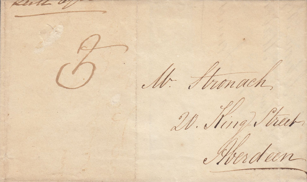 1836 SCOTLAND/"OLD MELDRUM" TWO LINE HAND STAMP. Wrapper Old Meldrum to Aberdeen dated 17th March 1836, charged "5" and on front fine strike two line "OLD/MEDRUM" hand stamp in black. (Ref 115283).