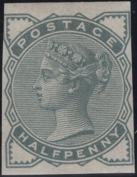 1884 STAMP COMMITTEE DE LA RUE ½D GREENISH-GREY IMPERF COLOUR TRIAL (SG187) WHITE PAPER WMK CROWN, GOOD UNUSED. Good unused 1884 Stamp Committee ½d (SG187) imperf colour trial in greenish-grey, white paper, wmk Crown. Design touched at upper left otherwise very close but clear margins with fine original gum and fine colour. Very rare. (Ref 142196).