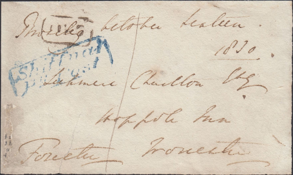 1830 FREE FRONT SHIFNAL TO WORCESTER WITH 'SHIFFNAL/PY POST' HAND STAMP (SH552). Free front, some soiling from Broseley to Worcester dated October 16 1830 with Penny Post charge of '1'. On front good to fine strike boxed 'Shiffnal/Py Post' hand stamp in blue (SH552) and fair strike boxed 'No.2' receiving house hand stamp of Broseley in black. (Ref 125820).