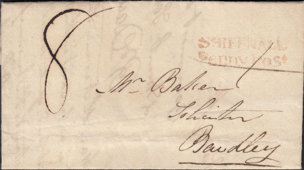 1819 MAIL CHIRK TO BEWDLEY WITH 'SHIFFNALL/PENNY POST' HAND STAMP (SH550). Letter Chirk to 'Mr. Baker, Solicitor Bewdley' dated Nov 15 1819, charged '8' and on front good to fine strike 'SHIFFNALL/Penny Post' hand stamp in red (SH550). On reverse fair strike boxed 'No.3' receivers hand stamp of Much Wenlock. (Ref 125856).