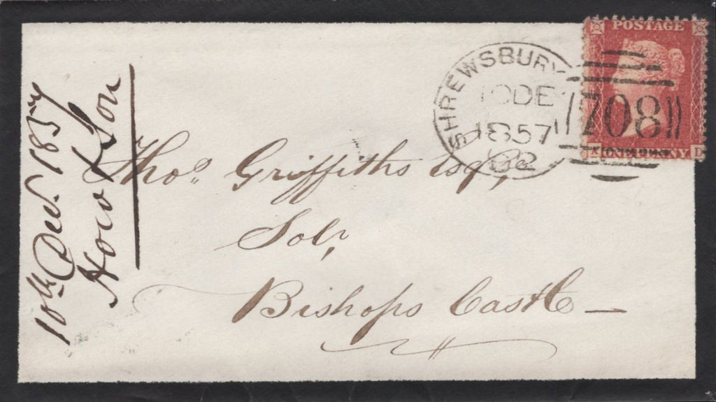 1857 MOURNING ENVELOPE SHREWSBURY TO BISHOPS CASTLE WITH 'SHREWSBURY/708' SPOON TYPE C2 (RA119). Fine mourning envelope from Shrewsbury to 'Thos. Griffiths Esq, Solr, Bishops Castle' with fine die 2 1d rose-red on white paper (SG40) lettered AD tied fine strike 'SHREWSBURY/708' spoon type C2 (RA119) 10 DE 1857 codes 'D2'. On reverse good strike 'BISHOPS.CASTLE' double ring date stamp DE 11 1857. (Ref 130021).