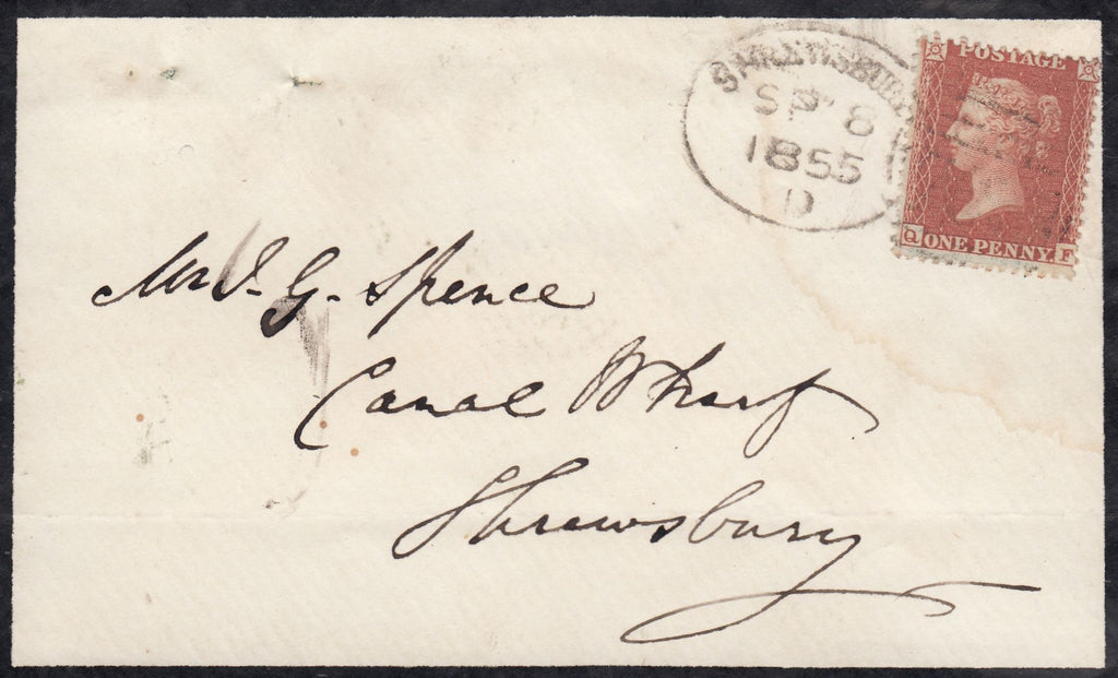 1855 MAIL USED IN SHREWSBURY WITH 'SHREWSBURY/708' SPOON (RA116) AND 'BASCHURCH' UDC. Mourning envelope, slight soiling, used locally in Shrewsbury addressed to 'Mr J. G. Spence, Canal Wharf, Shrewsbury' with fine to very fine die 2 1d S.C.14 (SG24) lettered QF with very fine perforations tied good strike 'SHREWSBURY/708' spoon type 'A' (RA116) SP 8 1855 code 'D'. This month unrecorded by Arundel/Taylor. On reverse light strike 'BASCHURCH' udc in black. (Ref 131561).