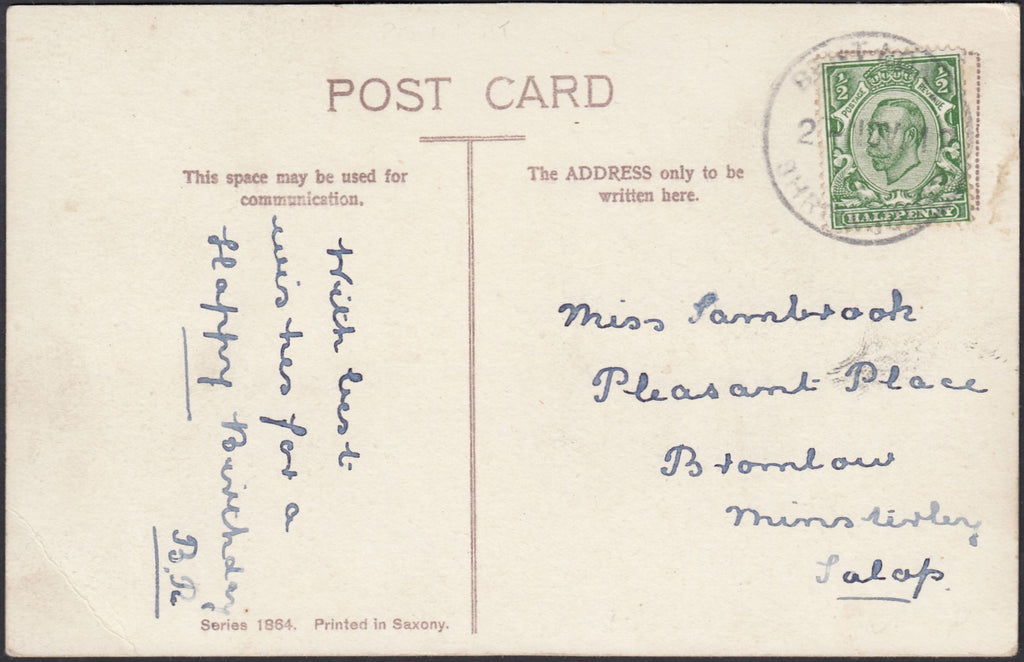 1912 MAIL BENT LONT, SHROPS TO SALOP WITH 'BENT LONT/SHREWSBURY' RUBBER DATE STAMP. Post card to Minsterley, Salop with KGV ½d Downey cancelled good to fine strike 'BENT LONT/SHREWSBURY' rubber date stamp 2 NOV 12. (Ref 131582).