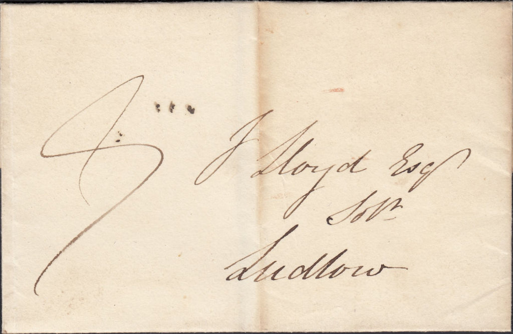 1824 MAIL BRIDGNORTH TO LUDLOW WITH 'BRIDGNORTH/138' CIRCULAR MILEAGE MARK (SH73), EARLIEST RECORDED USAGE. Wrapper from Bridgnorth to 'J Lloyd Esq, Solr, Ludlow' dated 31st Dec 1824, charged '9' and on reverse over flap good strike 'BRIDGNORTH/138' circular mileage mark type 35 (SH73) in black, this being earliest recorded usage. Ex Guy Bridges collection. (Ref 131665).