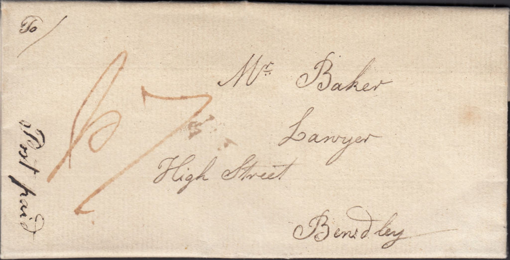 1828 LETTER BRIDGNORTH TO BEWDLEY WITH 'BRIDGNORTH/138' MILEAGE MARK (SH73). Fine letter from Bridgnorth dated February 23rd 1828 to 'Mr Baker, Lawyer, High Street, Bewdley', post paid '7' and on reverse good strike 'BRIDGNORTH/138' circular mileage mark type 35 in black (SH73). Writer concludes 'please to direct for Thos Jukes at the Drails near Bridgnorth to be left at the Post Office till called for'. (Ref 131670).