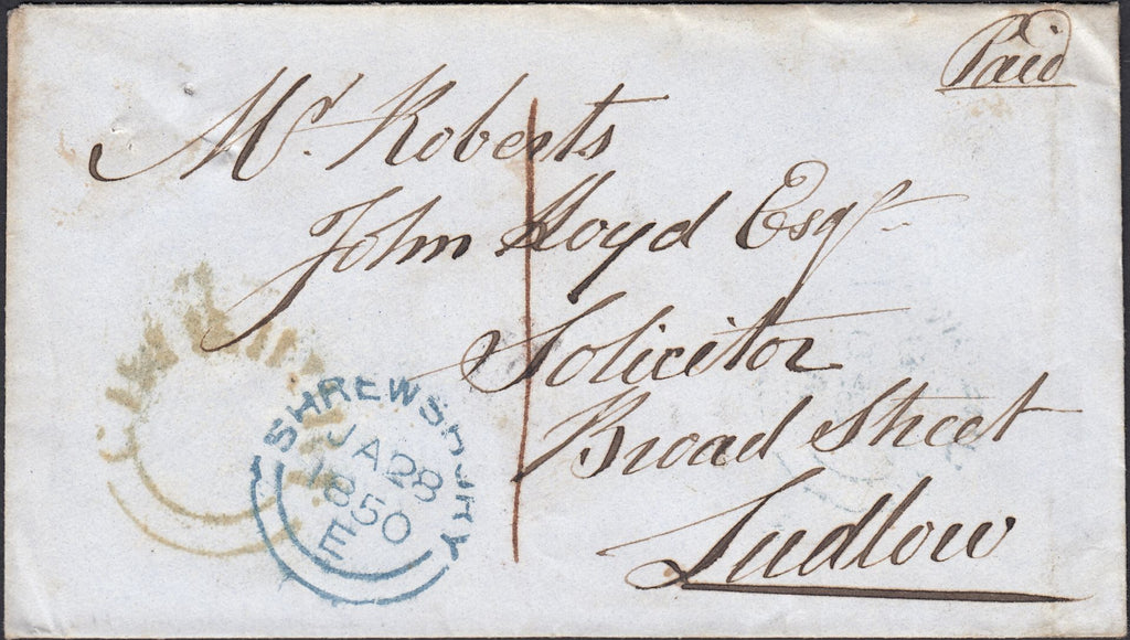 1850 MAIL CHIRBURY, SHROPS TO LUDLOW WITH 'CHIRBURY' UDC IN GREEN (SH104). Envelope from Chirbury, Shrops to 'Mr Roberts, John Lloyd Esqr., Solicitor, Broad Street, Ludlow', post paid '1', on front good strike 'CHIRBURY' udc in green (SH104) and 'SHREWSBURY' date stamp JA 28 1850 in blue. (Ref 131694).