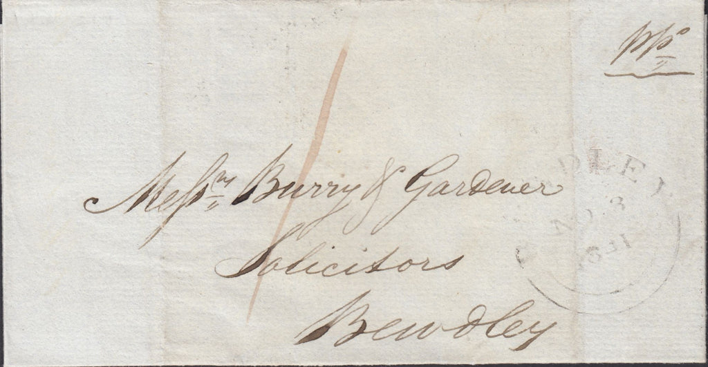 1841 WRAPPER CLEOBURY MORTIMER, SHROPSHIRE TO BEWDLEY WITH 'CLEOBURY/PENNY POST' HAND STAMP (SH114). Wrapper from Cleobury Mortimer to 'Mefsrs. Burry and Gardener, Solicitors, Bewdley' with post paid '1' and on front light strike 'BEWDLEY' date stamp NO 3 1841. On reverse good strike 'Cleobury/Penny Post' hand stamp in black (SH114), filing fold affects. (Ref 132488).