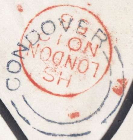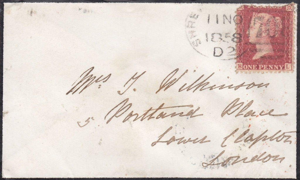 1858 MAIL SHREWSBURY TO LONDON WITH 'SHREWSBURY/708' SPOON (RA119) ALSO 'CONDOVER' AND 'CRESSAGE' UDC'S. Mourning envelope from Shrewsbury to Lower Clapton in London with die 2 1d rose-red on white paper (SG40) lettered RL, damaged at top tied good strike 'SHREWSBURY/708' type C2 Spoon (RA119) 11 NO 1858 codes D2. On reverse fine strike 'CRESSAGE' udc in black (19mm) also fine strike 'CONDOVER' udc in dark blue, part overstruck 'LONDON' date stamp in red NO 12 58. (Ref 132538).
