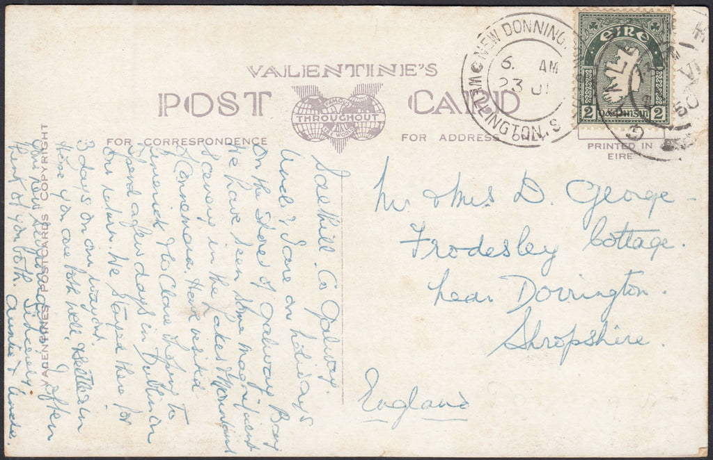 1950 MAIL IRELAND TO DORRINGTON, SHROPSHIRE BUT MISSENT TO NEW DONNINGTON, SALOP WITH 'NEW DONNINGTON' DATE STAMP. Post card from Galway in Ireland to 'Mr and Mrs D George, Frodesley Cottage, near Dorrington, Shropshire, England' with Irish 2 map stamp cancelled 'GALWAY' date stamp 21 VI 50 but missent to New Donnington in Shropshire and alongside fine strike 'NEW DONNINGTON/WELLINGTON, SALOP' date stamp 23 JU. Unusual missent mail. (Ref 133010).