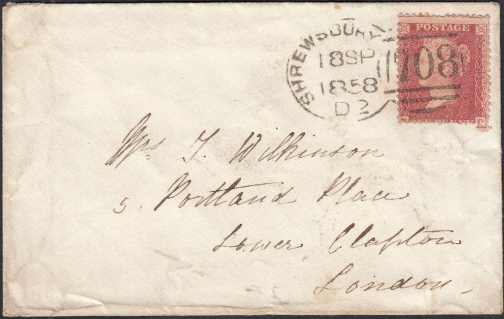 1858 MAIL SHREWSBURY TO LONDON WITH 'SHREWSBURY/708' SPOON TYPE C2 (RA119), ALSO 'CRESSAGE' AND 'CONDOVER' UDCS. Envelope, some soiling, from Shrewsbury to Lower Clapton, London with die 2 1d rose-red on white paper (SG40) lettered TD, centred low and several short perforations tied good to fine strike 'SHREWSBURY/708' spoon type C2 (RA119) 18 SP 1858 codes D2. On reverse fair strike 'CRESSAGE' udc and good to fine strike 'CONDOVER' udc. (Ref 133021).