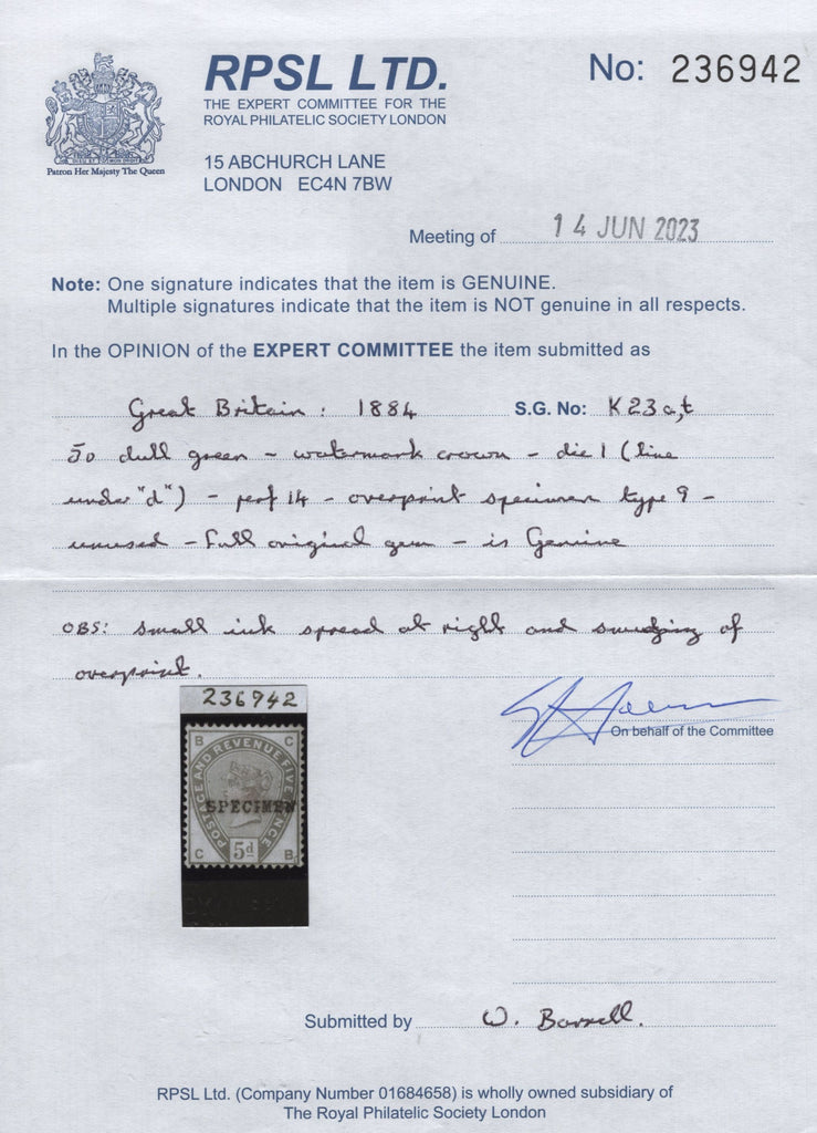 1884 UNISSUED 5D GREEN WITH 'LINE UNDER d' OVERPRINTED 'SPECIMEN' TYPE 9 (SG193 SPEC K23t). A fine example of the extremely rare 1884 unissued 5d green (SG193) lettered CB with 'LINE UNDER d' overprinted 'SPECIMEN' type 9 (Spec K23t). Excellent colour and very fine original gum. RPSL cert 236942 (2023) 'full original gum is genuine, small ink spread at right and smudging of overprint'. One of only seven examples recorded, the others lettered BA CC CD DD SG and SH. Cat £13,500. (Ref 141796).