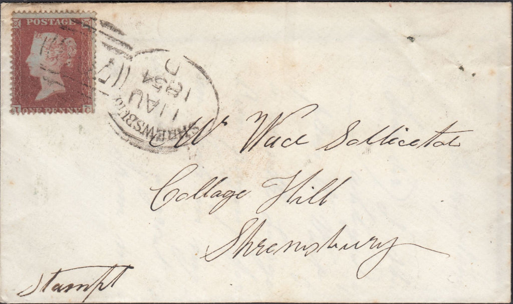 1854 MAIL USED IN SHREWSBURY WITH 1D (SG17) CANCELLED 'SHREWSBURY/708' SPOON (RA116) AND 'BERRINGTON' UDC. Envelope with letter from Berrington to 'Mr Wace, Solicitor, College Hill, Shrewsbury' with good to fine die 1 1d S.C.16 (SG17) lettered IC tied good strike 'SHREWSBURY/708' spoon type 'A' (RA116) 11 AU 1854 code 'D', this month unrecorded by Arundel/Taylor. On reverse fine strike 'BERRINGTON' udc in green. (Ref 131569).
