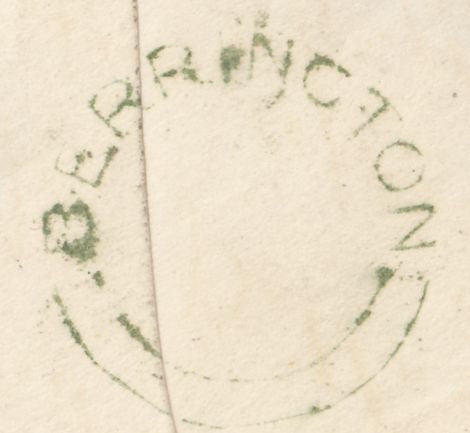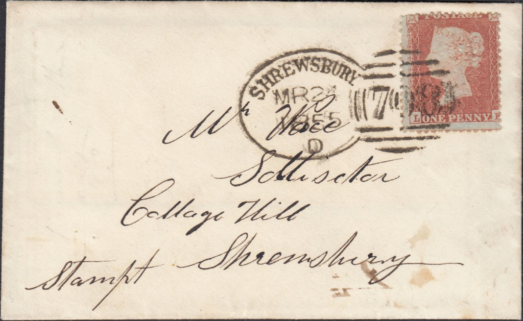 1855 MAIL USED IN SHREWSBURY WITH 'SHREWSBURY/708' SPOON (RA116) AND 'BERRINGTON' UDC. Envelope and letter from Berrington in Shropshire to 'Mr Wace, Solicitor, College Hill, Shrewsbury' with die 1 1d S.C.14 (SG22) lettered LF, several short perforations at upper left and pin holes, tied fine strike 'SHREWSBURY/708' spoon type 'A' (RA116) MR 24 1855 code 'D'. On reverse fine strike 'BERRINGTON' udc in green. (Ref 131572).