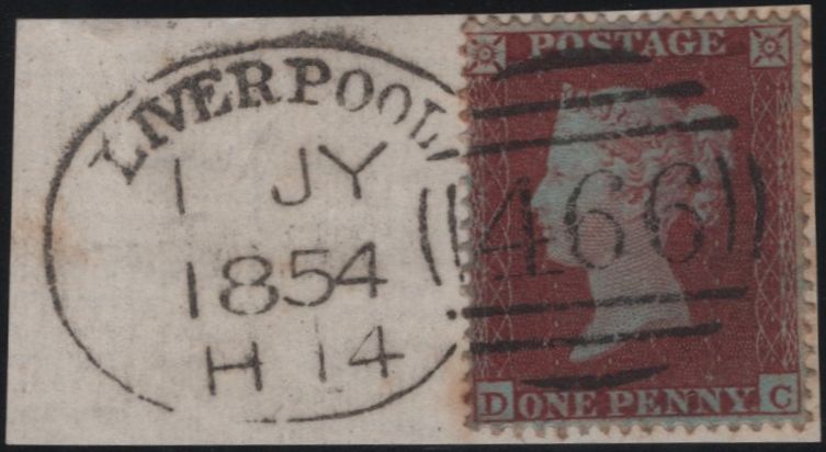 1854/1855 SMALL PIECES X 4 WITH LIVERPOOL CANCELLATIONS TYPE 'A14' (RA51). Four fine dated pieces 1854/1855 with fine strikes 'LIVERPOOL/466' spoon type 'A14' (RA51), dated 1 JY 1854 code 'H' with very fine SG17 lettered DC, 18 DE 1854 code 'O' fine SG17, 28 DE 1854 code 'N' good used SG17 and 21 FE 1855 code 'R' very fine SG17 lettered HI. An attractive lot. (4 items). (Ref 141172).