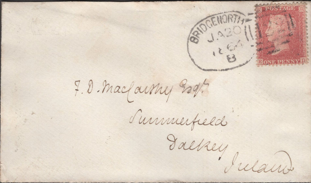 1864 MAIL BRIDGENORTH TO DALKEY, IRELAND WITH DIE 2 1D ROSE-RED ON WHITE PAPER (SG40) 'BRIDGENORTH/122' SPOON CANCELLATION (RA24). Envelope Bridgenorth to Dalkey, Ireland with fine Die 2 1d rose-red on white paper (SG40) lettered ED tied fine strike 'BRIDGENORTH/122' spoon cancellation (RA24) JA 20 1864 code 'B'. (Ref 141466).