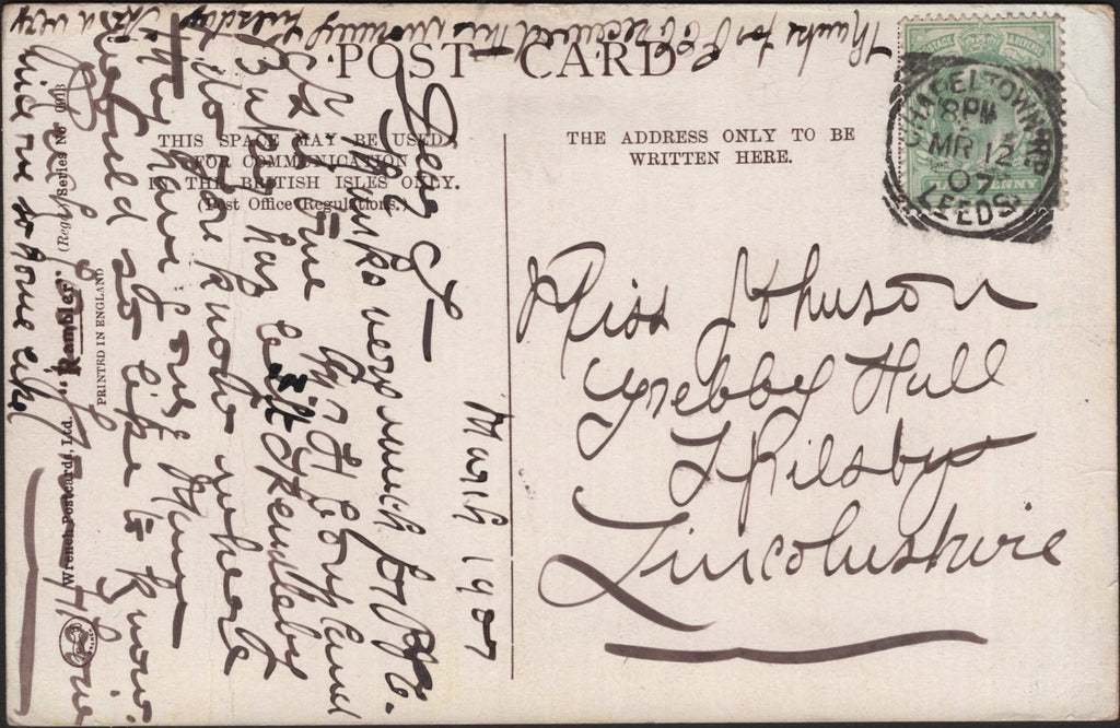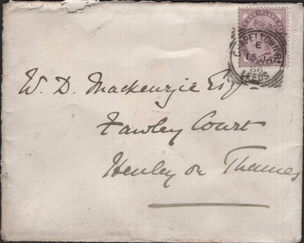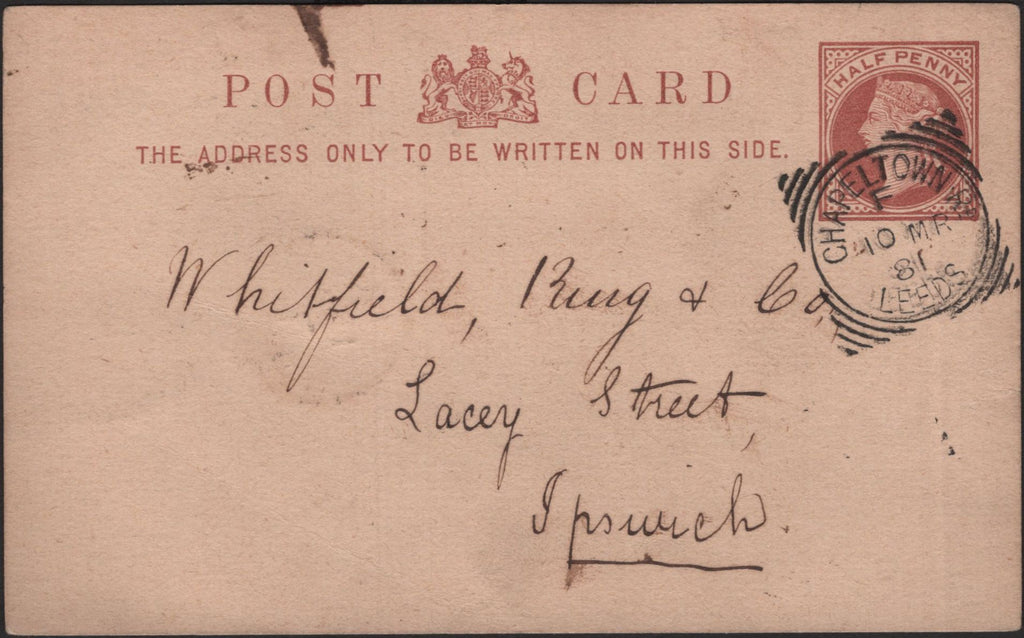 GROUP OF 'CHAPELTOWN.RD/LEEDS' SQUARED CIRCLES (5 ITEMS). Group comprising four post cards with 1881 usage addressed to the stamp dealer 'Whitfield King and Co, Lacey Street, Ipswich', also 1886 envelope to Henley, 1881-1907 all with fine strikes 'CHAPELTOWN.RD/LEEDS' squared circle cancellations. (5 items). (Ref 137861).