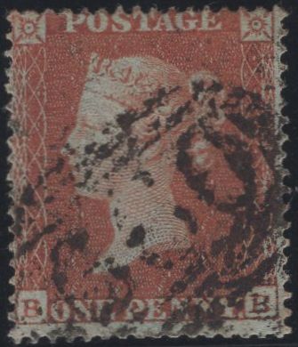 1854 DIE 1 1D RES.PL.4 (SG17)(BB). Used 1854 die 1 1d res.pl.4 S.C.16 (SG17) lettered BB, several shorter perforations at foot, cancelled slightly indistinct '660' numeral of Rugely (Staffs). (Ref 137118).