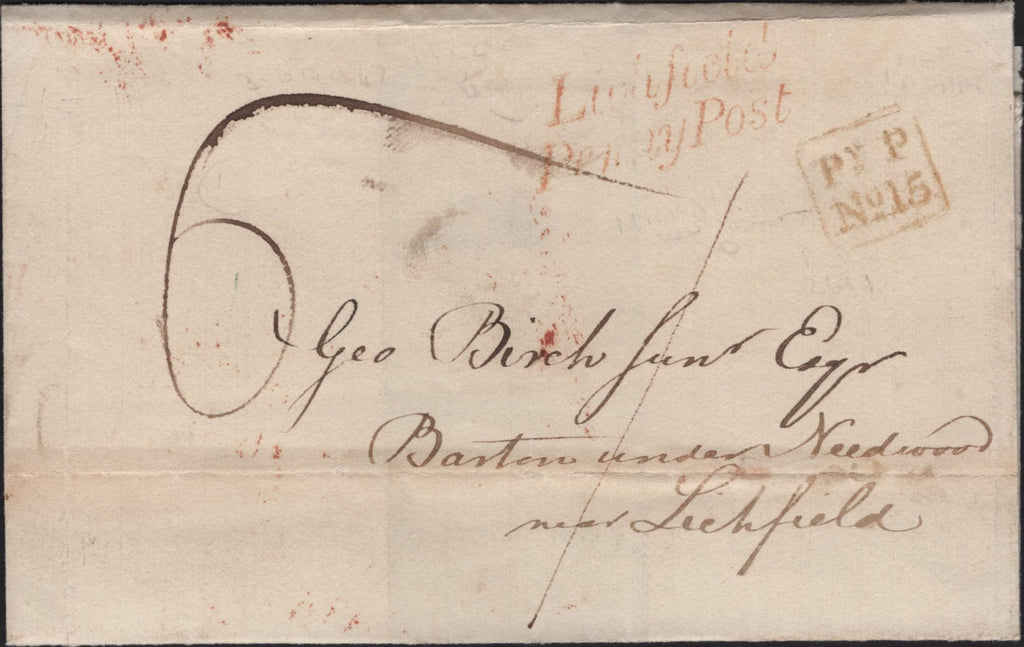 1838 MAIL HANDSWORTH, BIRMINGHAM TO LICHFIELD WITH HANDSWORTH 'PY P/No15' HAND STAMP (BM261) AND 'Lichfield/Penny Post' HAND STAMP (ST350). Fine wrapper from Handsworth dated 12th December 1838 to 'Geo Birch Junr Esq, Barton under Needwood, near Lichfield', charged '6' General Post and '1' Penny Post. On front fine to very fine strike boxed 'PY P/No15' Birmingham Penny Post hand stamp of Handsworth in red (SM261) and upon arrival good strike 'Lichfield/Penny Post' hand stamp in red (ST350). Filing fold clear of hand stamps. (Ref 141697).