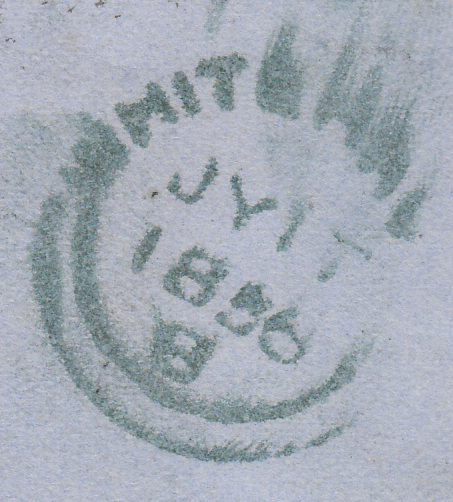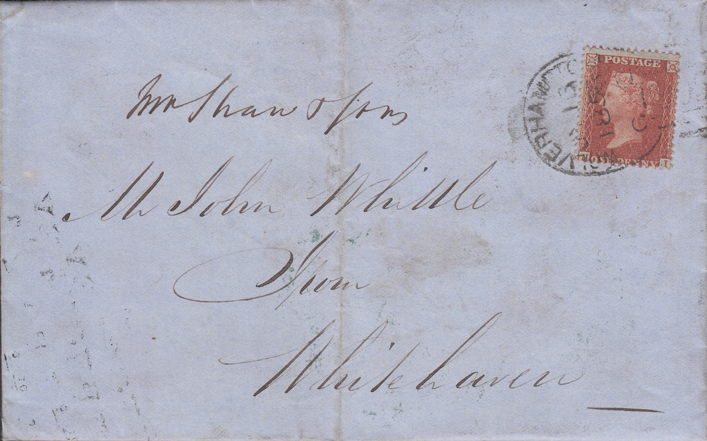 1856 WOLVERHAMPTON SPOON TYPE B (RA126)/PL.30 (HI)(SG29). 1856 entire, some soiling, Wolverhampton to Whitehaven with die 2 1d pl.30 red-brown on blued paper (SG29) lettered HI tied fair strike WOLVERHAMPTON/905 spoon type B (RA126) JY 16 1856. (Ref 54398).