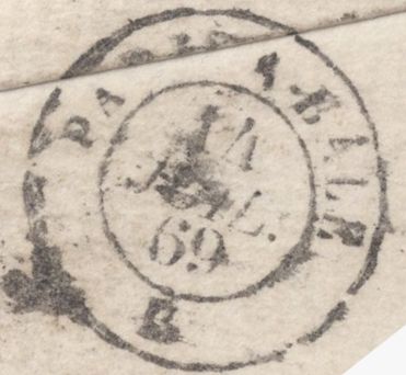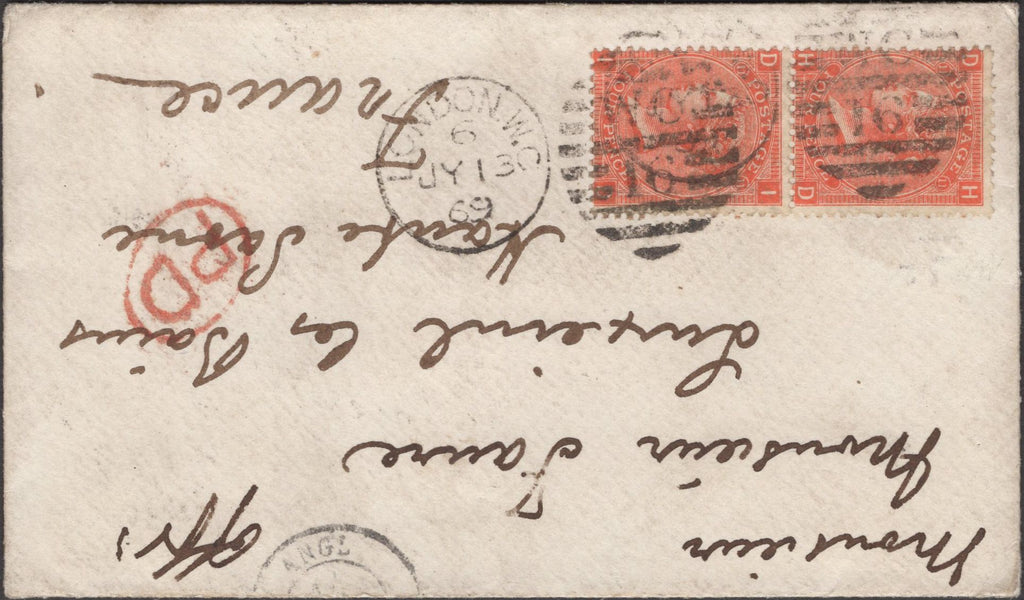 • 135163 1869 MAIL LONDON TO HAUTE SAVOIE, FRANCE WITH PAIR 4D VERMILION PL.11 (SG94).