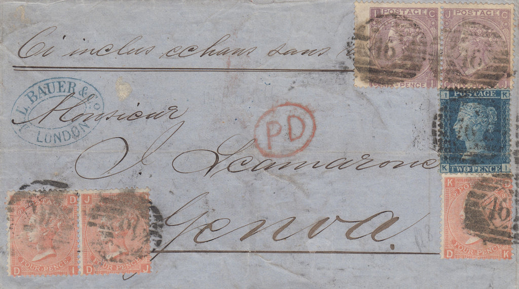 1866 SAMPLE MAIL LONDON TO GENOA, THREE COLOUR COMBINATION. Wrapper London to Genoa endorsed 'Ci inclus enhantillons sans valeur' (Samples without value), slight soiling and creasing with 2d blue pl.9 (SG45) lettered KI, 4d pale vermilion pl.8 (SG94) and 6d lilac pl.5 (SG97) X 2, all tied '46' London Inland Office numerals. On reverse London date NO 14 66. Stamps paying 1 oz 2s letter rate and 2d late fee. Unusual usage. (Ref 141522).