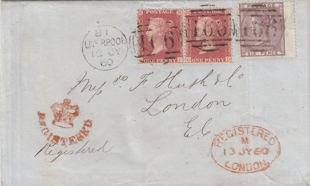 1860 REGISTERED MAIL LIVERPOOL TO LONDON WITH 6D LILAC (SG69) AND 1D (SG40) X 2. Fine wrapper sent registered mail Liverpool to 'Mefsrs. Huth and Co, London E.C' with 6d lilac (SG69) paying 6d registration fee, crease affects and 2 Die 2 1d rose-red on white paper (SG40) lettered GC GD paying 2d postage, stamps tied fine strikes 'LIVERPOOL/466' duplex 12 JY 60. On front very fine strike 'CROWN/REGISTERED' handstamp in red and London oval 'REGISTERED/13 JY 60/LONDON' date stamp. Clean usage. (Ref 141541).