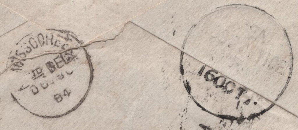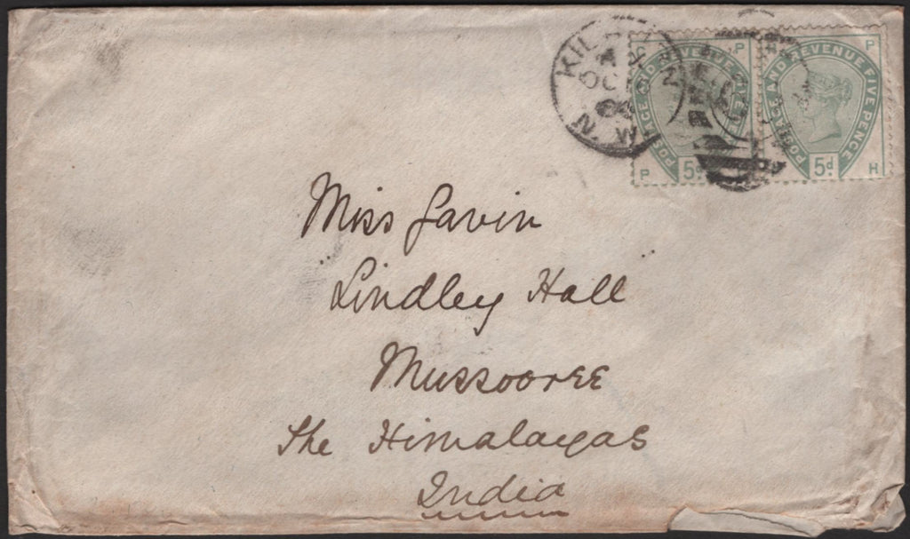 1884 MAIL KILBURN, LONDON TO MUSSOOREE, THE HIMALAYAS, INDIA PAIR 5D GREEN (SG193). Envelope, fault at lower right from Kilburn to 'Miss Gavin, Lindley Hall, Mussooree, The Himalayas, India' with pair 5d dull green (SG193) lettered PG PH, PH corner bend tied fair strike 'KILBURN/N.W./60' duplex OC 10 84 codes 'AX'. On reverse 'MUSSOOREE' date stamp OC 30 84. Unusual usage. (Ref 142391).