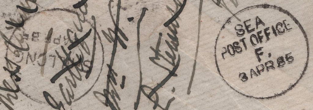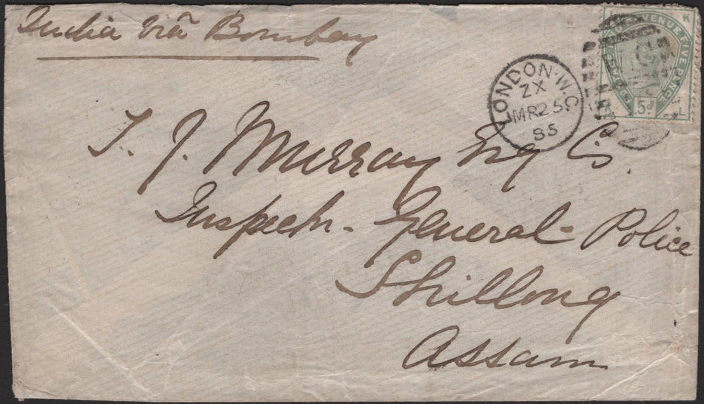 1885 MAIL LONDON TO SHILLONG, ASSAM 5D GREEN (SG193). Envelope London to 'T J Murray Esq, Inspector-General-Police, Shillong, Assam' endorsed 'India Via Bombay' with good 5d green (SG193) lettered KL tied good to fine strike 'LONDON/W.C. 10' duplex MR 25 85. On reverse 'SEA POST OFFICE' date stamp 3 APR 85 AND 'SHILLONG' date stamp 13 APR 85. Good usage. (Ref 142392).