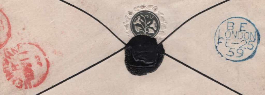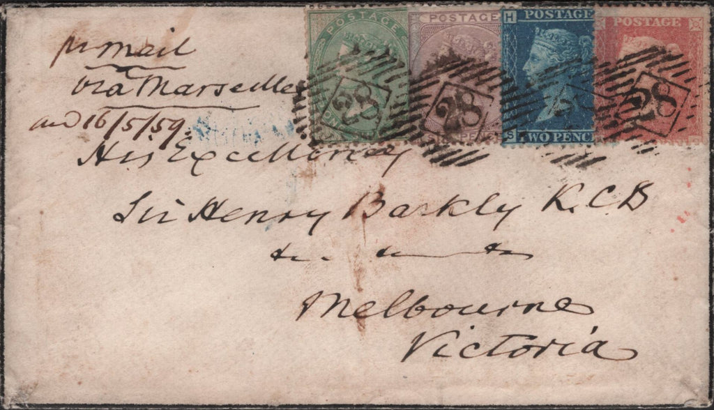 1859 FOUR COLOUR COMBINATION LONDON TO MELBOURNE, VICTORIA WITH 1S GREEN (SG72), 6D LILAC (SG68), 2D BLUE (SG45) AND 1D (SG40). Fine mourning envelope with letter from London to 'His Excellency, Sir Henry Barkly, KCB, Melbourne, Victoria' and endorsed 'pr mail via Marseilles'. Envelope with 1s green (SG72), 6d Lilac (SG68) 2d blue (SG45) and Die 2 1d rose-red on white paper (SG40), some overlapping of stamps but all clearly tied London '28' Inland Office numerals. On reverse 'LONDON' date stamp FE 25 59 and 'MELBOURNE' date stamp MY 11 59. A most attractive and rare FOUR COLOUR COMBINATION. (Ref 142402).