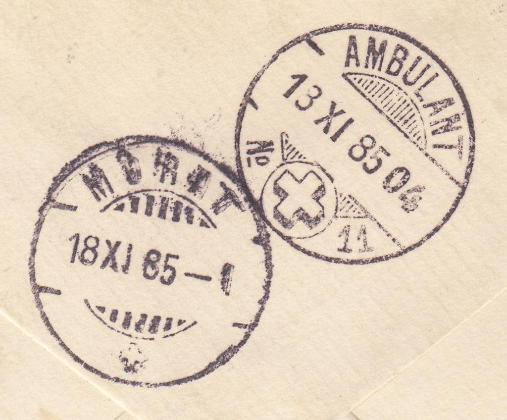1885 MAIL CANTERBURY, KENT TO SWITZERLAND 2½D LILAC (SG190). Envelope Canterbury to Morat, Switzerland with 2½d lilac (SG190) lettered IS tied fine strike 'CANTERBURY' squared circle NO 16 85, on reverse 'MORAT' date stamp 18 XI 85. (Ref 142727).