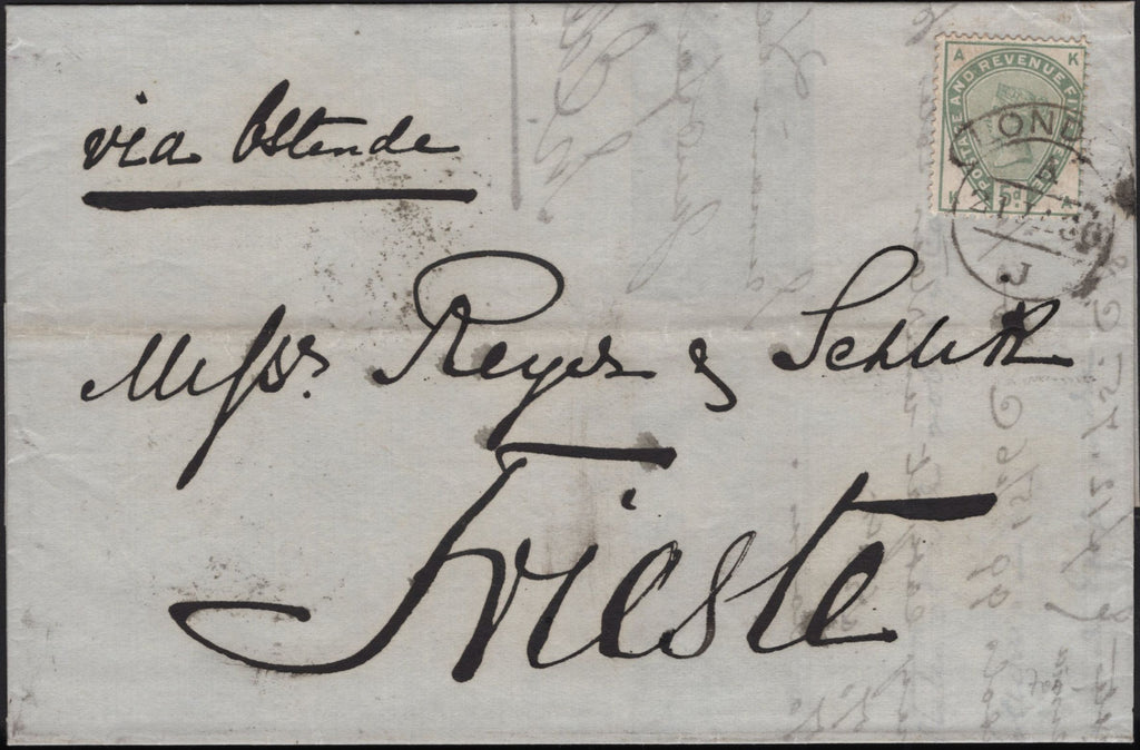 1886 MAIL LONDON TO TRIESTE 5D GREEN (SG193)(KA) FINE PLUG HOLDER FLAW 'A' LOWER RIGHT. Very fine wrapper from London to Trieste 'via Ostende' with fine to very fine 5d green (SG193) lettered KA tied fine strike 'LONDON' hooded circle date stamp 21 JA 86. On reverse 'TRIEST' date stamp 24 1 86. Stamp shows very fine 'PLUG HOLDER FLAW ON 'K' AT LOWER RIGHT, a fine variety unrecorded by SG but very similar to SG90a. (Ref 142825).