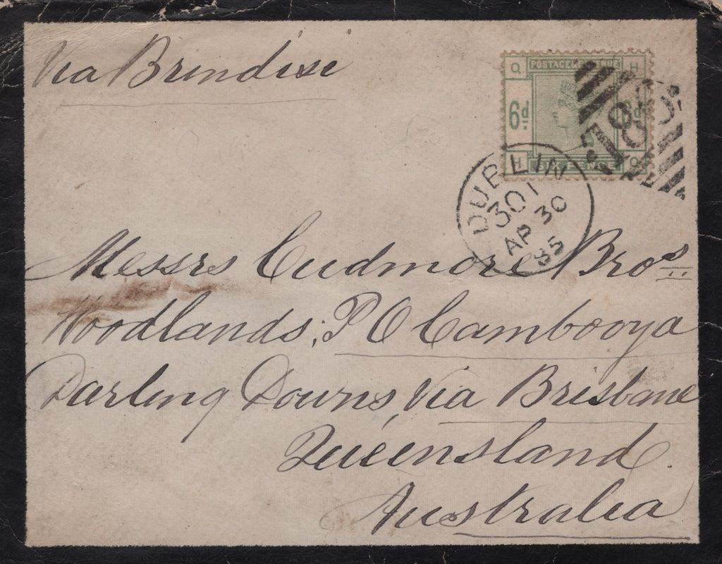 1885 MOURNING ENVELOPE DUBLIN TO QUEENSLAND, AUSTRALIA 6D DULL GREEN (SG194). Mourning envelope, peripheral faults Dublin to Queensland, Australia with good 6d dull green (SG194) lettered HQ tied fine strike 'DUBLIN/186' duplex AP 30 85. On reverse 'BRISBANE' date stamp JU 18 85 and 'CAMBOOYA/QUEENSLAND' date stamp JU 19 1885. Imperfections but priced accordingly. (Ref 142826).
