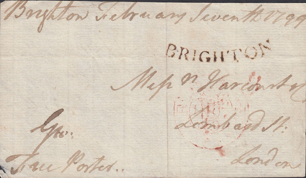 1799 SUSSEX/'BRIGHTON' CONCAVE HAND STAMP (SX162). Front Brighton to London dated Feb 7th 1799 with very fine strike 'BRIGHTON' concave style hand stamp in black (SX162). Hand stamp used 1 year later than County Cat. records. (Ref 117345).