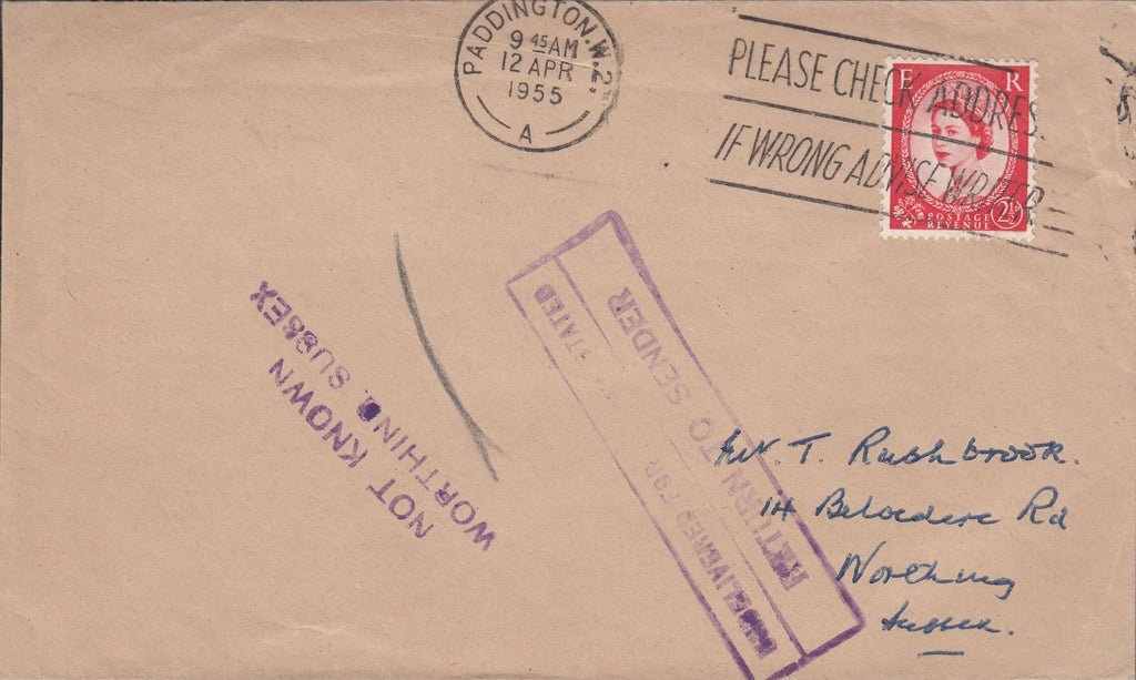 1955 MAIL PADDINGTON TO WORTHING/'NOT KNOWN WORTHING SUSSEX' HAND STAMP. Envelope Paddington to Worthing Sussex with Wilding 2½d cancelled PADDINGTON 12 APR 1955, fine strike 'NOT KNOWN/WORTHING SUSSEX' instructional and boxed cachet 'UNDELIVERED FOR REASON STATED/RETURN TO SENDER'. (Ref 118834).