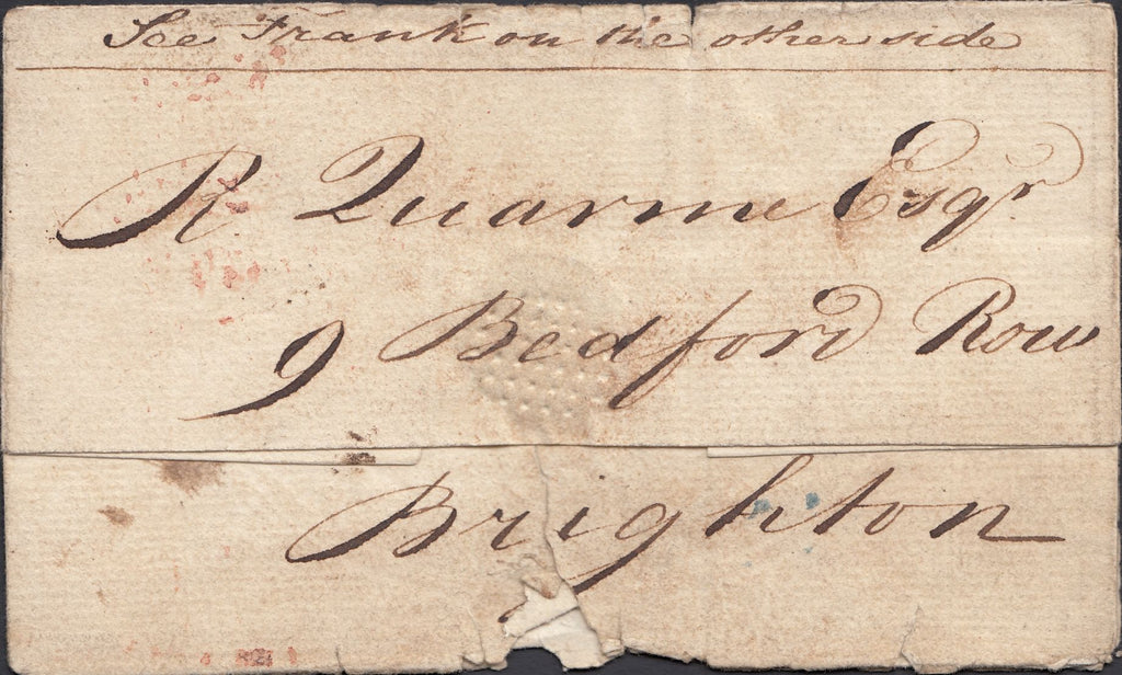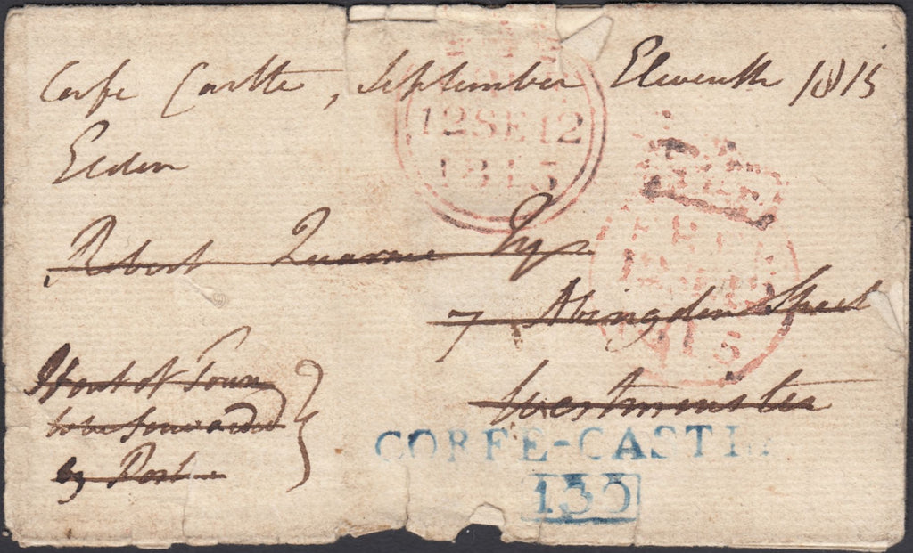 1815 FREE FRONT CORFE CASTLE TO WESTMINSTER REDIRECTED TO BRIGHTON/'CORFE-CASTLE 130' MILEAGE MARK IN BLUE. Free front, some faults, from Corfe Castle dated September 11th 1815 to Westminster with London date stamp 12 SE 1815, also on front good strike 'CORFE-CASTLE/130' mileage mark in blue, unrecorded in county cat. On reverse letter redirected to Brighton. (Ref 119798).