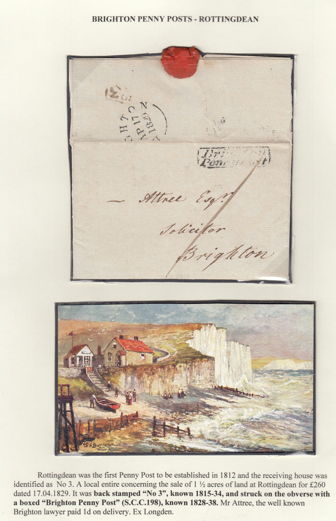 1829 MAIL USED LOCALLY IN BRIGHTON WITH 'BRIGHTON/PENNY POST' HAND STAMP (SX198). Fine letter used locally in Brighton addressed to 'Attree Esqr., Solicitor, Brighton' with charge of '1', on front good strike 'Brighton/Penny Post' hand stamp in black (SX198). On reverse fair strike boxed 'No.3' receiver's hand stamp and 'BRIGHTON' date stamp AP 17 1829. (Ref 129642).
