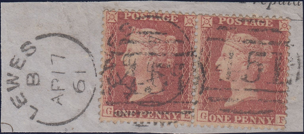 1861 'LEWES/451' SIDEWAYS DUPLEX/1D PL.46 (SG40)(GE GF). Small piece with fine used horizontal pair die 2 1d pl.46 rose-red on white paper (SG40) lettered GE GF tied fine strikes 'LEWES/451' sideways duplex AP 17 61 code 'B'. Stamp 'GE' shows fine 'G DOUBLE'. (Ref 131217).
