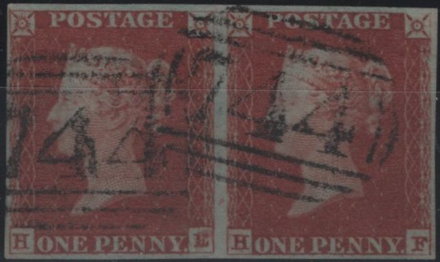1848 1D PL.78 (SG8) HORIZONTAL PAIR LETTERED HE HF, FINE USED. Fine used horizontal pair 1848 1d pl.78 (SG8) lettered HE HF, four close to fine margins and cancelled '744' numeral of Steyning, Sussex. (Ref 138701).
