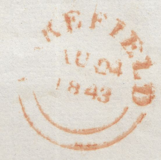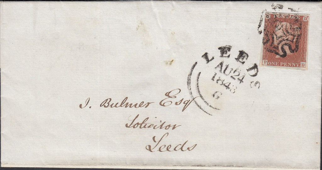 PL.33 (SG8)(PD) ON COVER WAKEFIELD TO LEEDS. Letter Wakefield to 'J Bulmer Esq Solicitor Leeds' dated 24 Aug 1843 with 1d pl.33 (SG8) lettered PD, touched at upper left otherwise good margins and tied black Maltese Cross of Wakefield (stamp position possibly altered?) and alongside LEEDS date stamp AU 24 1843. On reverse WAKEFIELD date stamp AU 24 1843 in red. (Ref 120056).