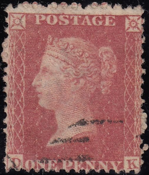 PL.52 (DK)(SG40) CONSTANT VARIETY. Fine used 1857 die 2 1d pl.52 rose-red on white paper (SG40) lettered DK showing constant variety "DOT OVER "S" OF POSTAGE". Very lightly cancelled clear of variety. (Ref 111828).