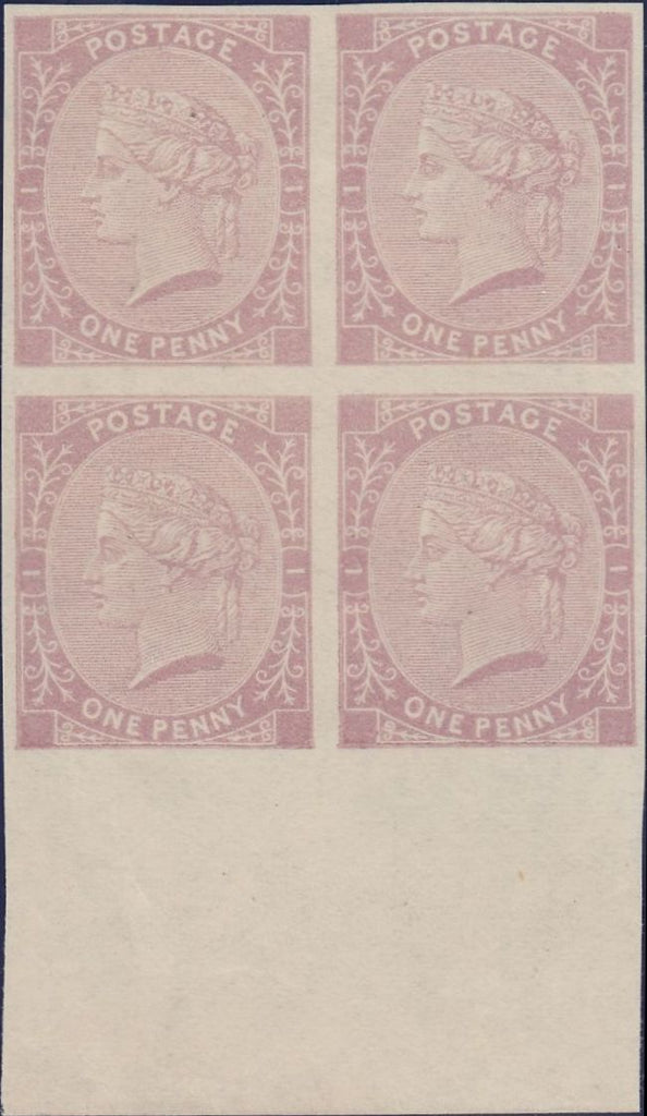 1879 TENDER ESSAY BY PERKINS BACON WITH RIDGWAY HEAD. A very fine lower marginal block of four 1879 Tender essay by Perkins Bacon using the Ridgway head in pale grey on thin unwatermarked white paper. (Ref 117774).