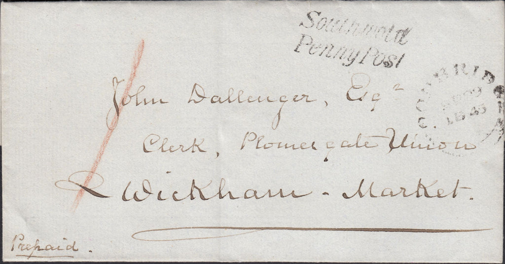 1845 MAIL SOUTHWOLD TO WICKHAM MARKET (SUFFOLK) WITH 'SOUTHWOLD/PENNY POST' HAND STAMP (SK311). Fine clean wrapper from Southwold to 'John Dallinger, Esqr. Clerk, Plomesgate Union, Wickham Market' with post paid '1'. On front fine to very fine strike 'Southwold/Penny Post' hand stamp in black (SK311) and WOODBRIDGE date stamp SP 29 1845. Very fine usage, and later usage of date stamp than recorded by Tom Slemons. (Ref 125214).